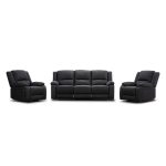 The design includes high backs and wide pillow-top arms, creating a comfortable and inviting seating experience. The suite includes four manual recliners in total — the 3-seater features two recliners on the end seats, and each single recliner includes its own manual recliner mechanism.